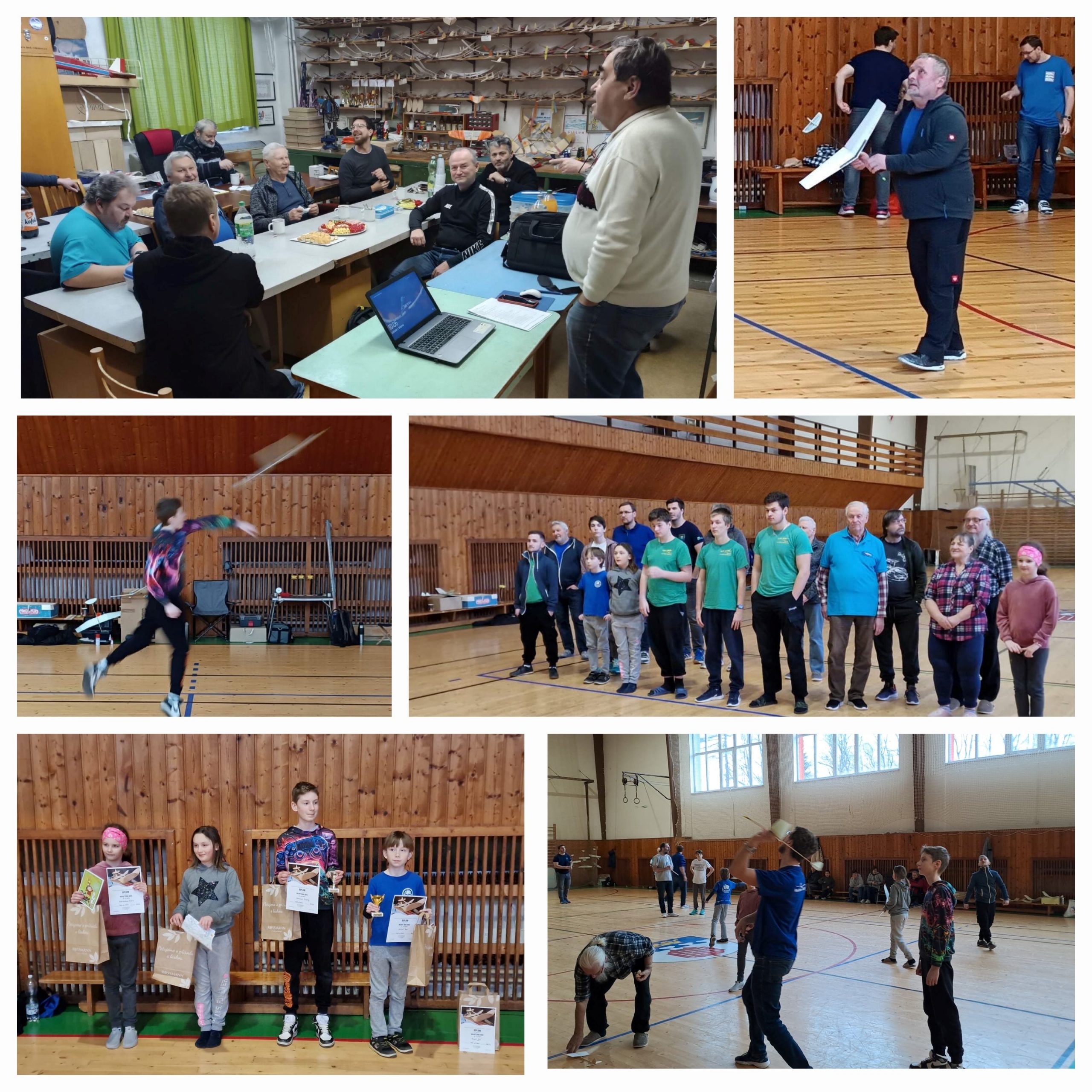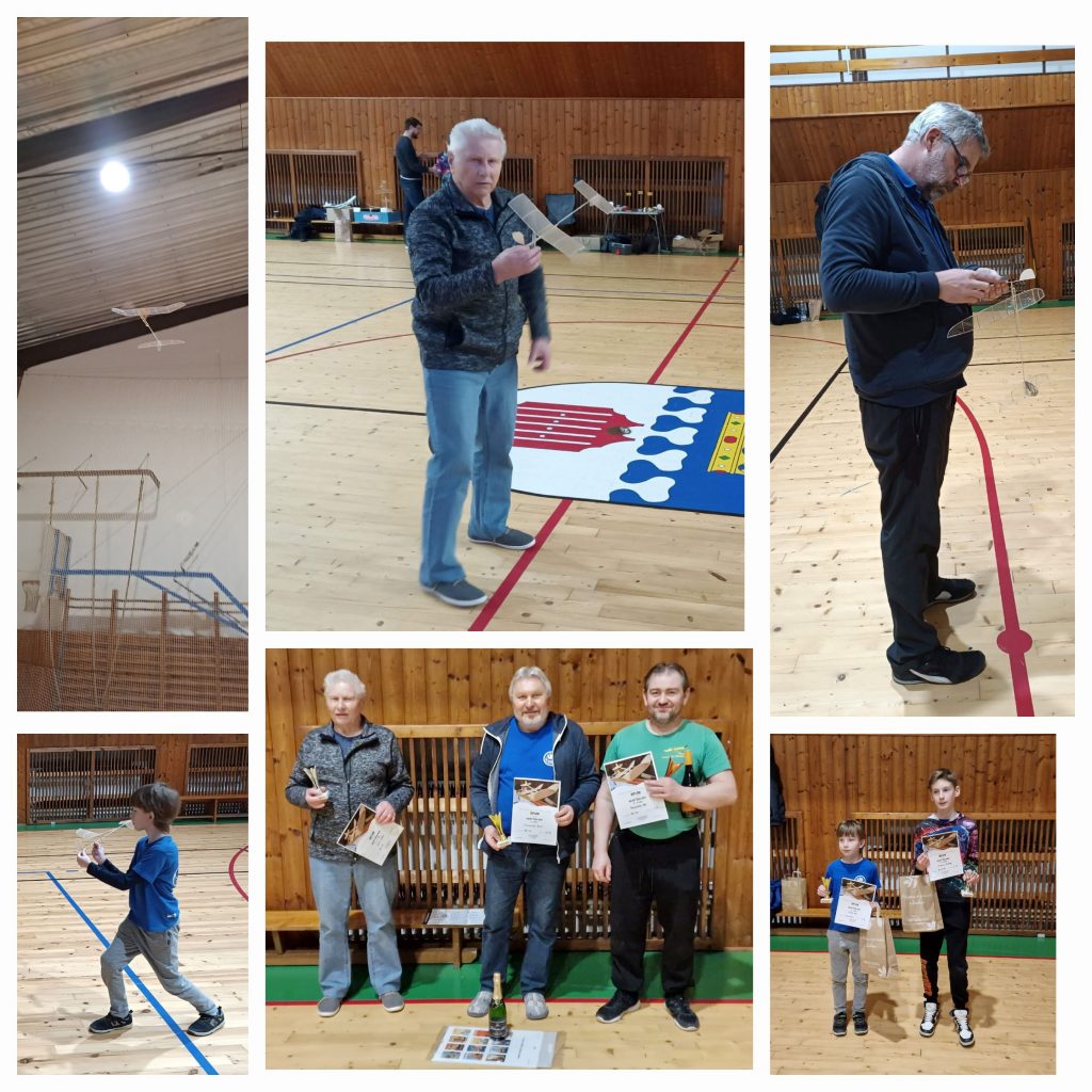 Po vyhlášení výsledků házedel byla odstartována druhá soutěž sobotního odpoledne, A6 tky. Tady nás doplnili Pavel Formánek a Eugen Belo. Kluci Peta a Ondra létali také a tak po vybalení nádobíčka a modelů jsme se pustili do natáčení gumových svazků. Především dospěláci se snažili v soutěži vyzkoušet rady ze školení a své letící gumáčky se zkoušeli usměrňovat teleskopickými pruty aby tak zabránili zavěšení modelů na konstrukci stropu či srážce s překážkou. Někdy to šlo lépe, jindy hůře. Co se týče výkonů….. vedení se hned od prvních letů ujal Pavel Formánek, který nakonec zaletěl pěkných 10 minut a 50 vteřin. Brzo se k němu přidal Eugen, který sice neměl tak úspěšné lety, ale stačilo to na 2. místo a trojici doplnil Petr Blaschka z Vilémova s časem 7:24. Tenhle čas se mě ani zdaleka nepodařilo zalétat a tak jsem zůstal zase na 4. místě. Tohle umístění mě ale netěšilo, létá mi to lépe. V mladších žácích si to nakonec rozdali jen naši Petr s Ondrou a s konečným výsledným pořadím jako v házedlech.